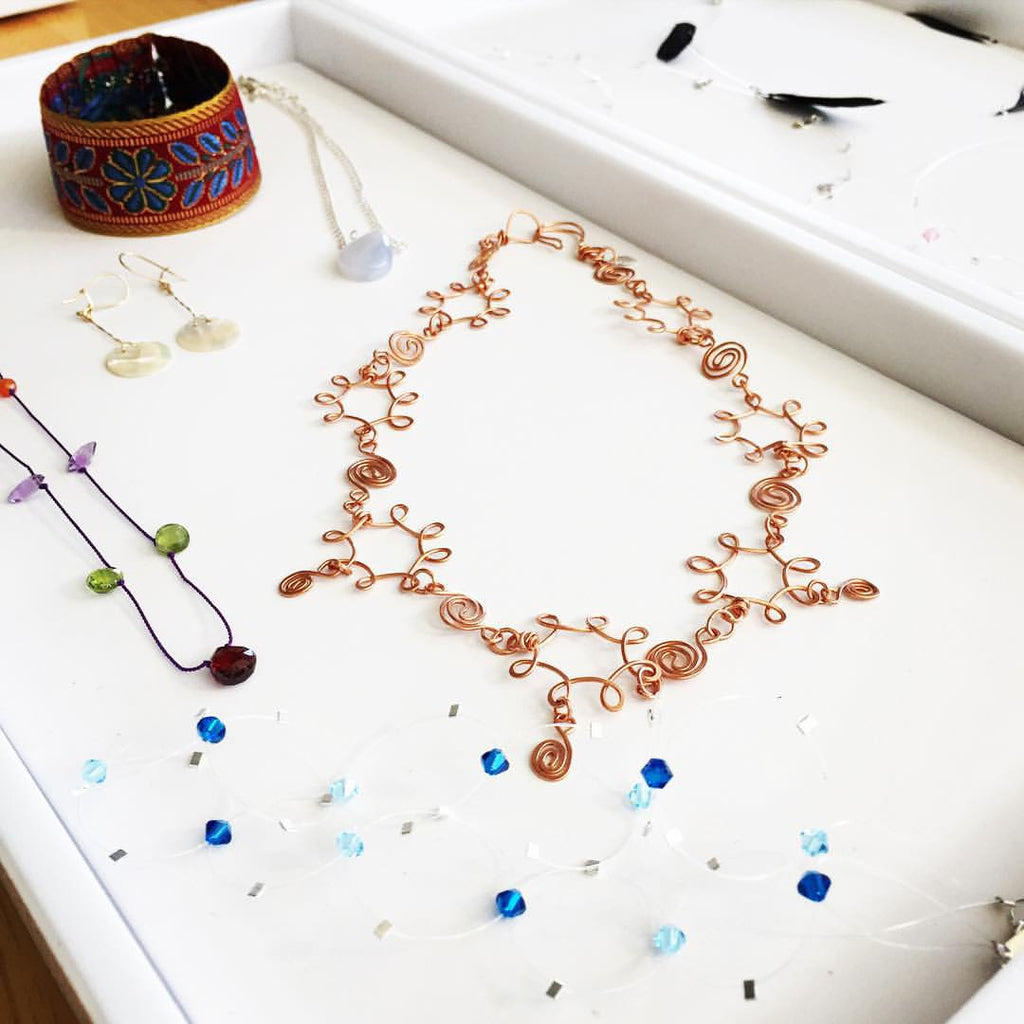 This piece is the result of a lot of hard work! Hand formed links that are hand hammered to create a mix of swirls and curlicues. I used copper wire because I saw so many artisans on Telegraph Avenue using them for hair pins and bracelets when I was a student at UC Berkeley. Is the copper wire from a hardware store? Yes, yes it is.