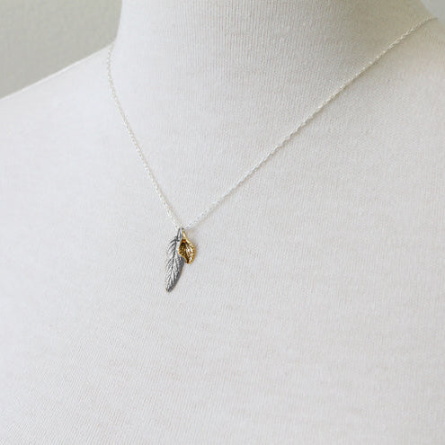 Detailed little leaf charms are paired for this charming necklace duo! A larger sterling silver leaf is nestled with a gold plated silver leaf. A classic PLC design, I can only make two more!