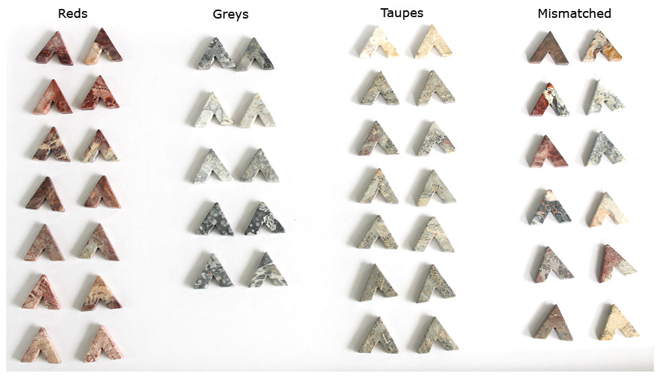 I have limited quantity of these amazing flower jasper stones that are cut into cute and unusual chevron shapes! Shades vary from cool black and white, creamy yellow and taupe, to a grey brick red. Each stone pairing will be unique! On your choice of a hammered textured sterling silver or gold plated silver post.