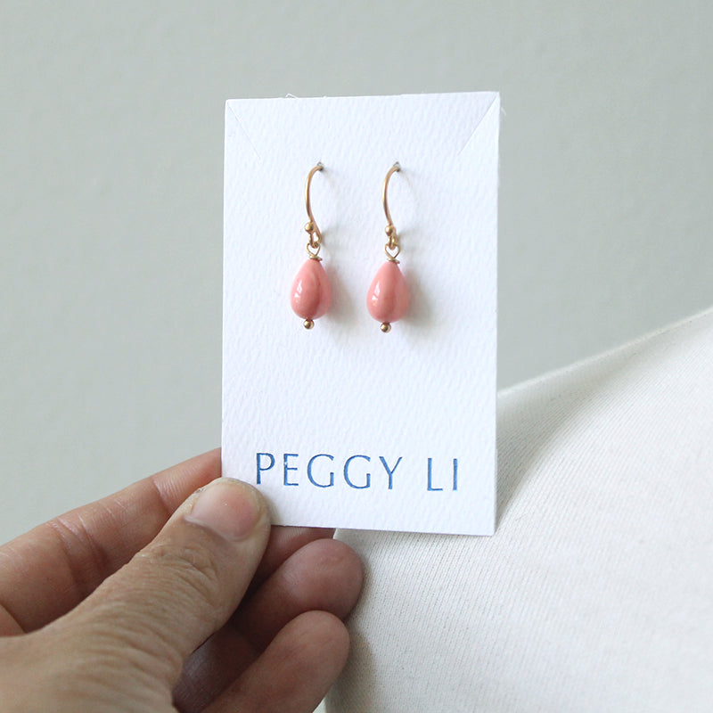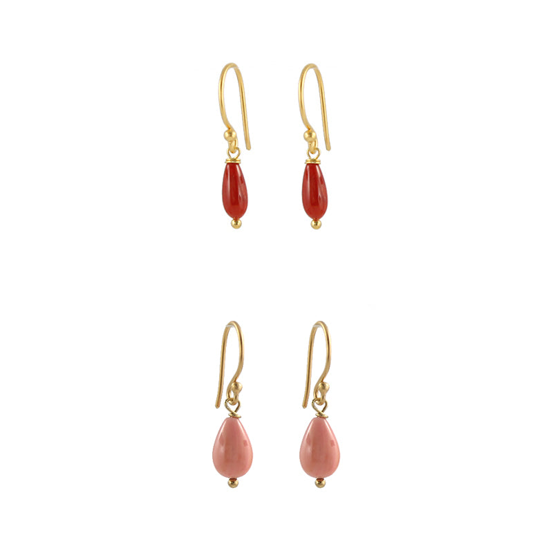 A recent customer request had me going back into my bead stash for these coral beauties. I will probably not buy any more coral in the future, so when these are gone, they will be gone. Choose either a deep red-orange dyed bamboo coral or a soft pink coral droplet - on sterling silver or rich 14k gold plated silver.