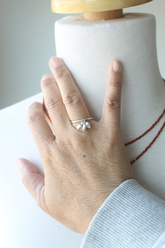 Like you, I was immediately mesmerized by the ring worn by Lucy (Dakota Johnson) in the movie The Materialists. A simple silver band with three dangling heart charms - I had to make one for myself and now here it is for you! Sterling silver band, 1.5mm in width and three charming sterling silver puffy heart charms for a delightfully feminine and hopeful ring full of love.