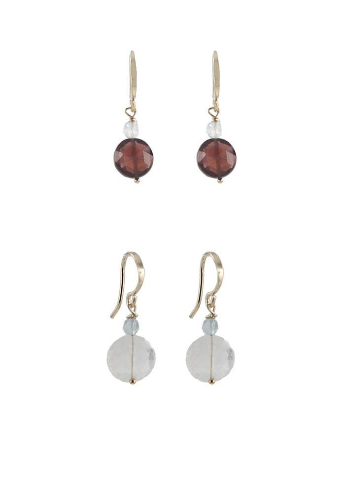 Bestselling Mermaid Quartz Earrings design with new coin gemstone combinations! These feature rich red garnet (sold out) and glowing moonstone, each paired with a pale blue aquamarine for a fresh pop of cool color. Unexpected color combinations are what make this design so special!