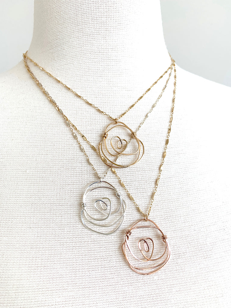 The Rosette pendant is made of square wire folded by hand (so no two will be alike!) to make an abstract rose blossom. The pendant is available in 14k gold-filled, 14k rose gold-filled, or sterling silver, with a dapped chain.