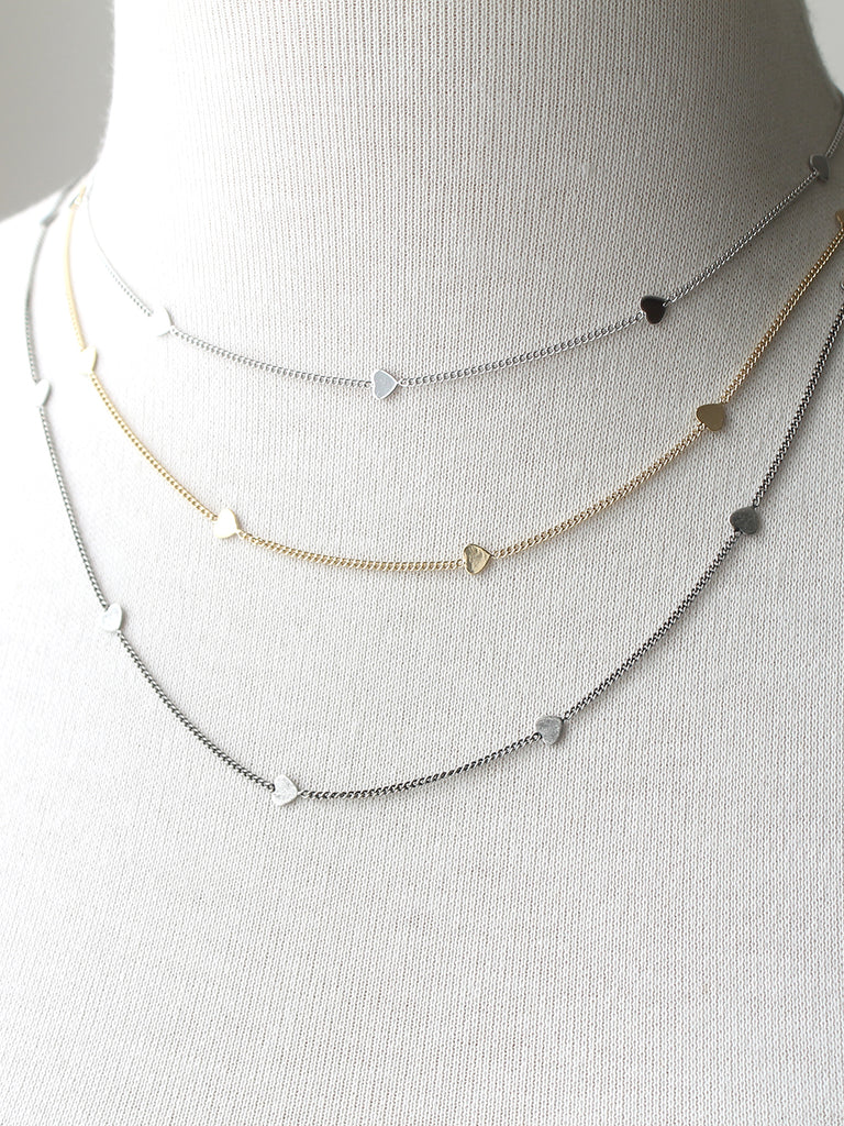 Simple hearted Simple Hearts Necklace is so sweet! Tiny hearts on a curb chain can be worn shorter 14" (choker length) or longer for a layering piece that is feminine and whimsical. Available in gold overlay, simple silver plate, or a darkened oxidized silver plate, all beautiful durable finishes.