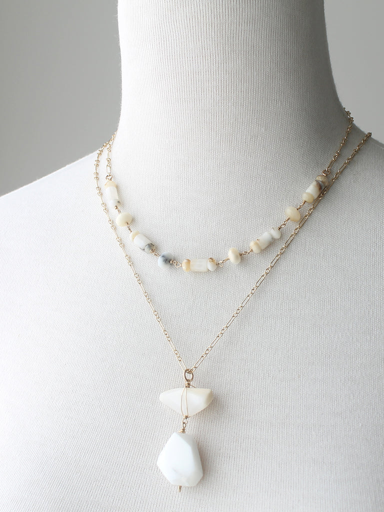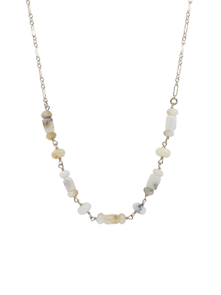 Feeling so crisp and fresh for summer, I love these white opal stones in their mix of smooth rondells and tube beads. The stones are a mix of white, translucent white and subtle creamy golds. Hand-wired and added to smooth long and short chain for maximum mix-n-match impact. Nothing feel more luxurious (to me) than wearing white and these will never fade or get stained!